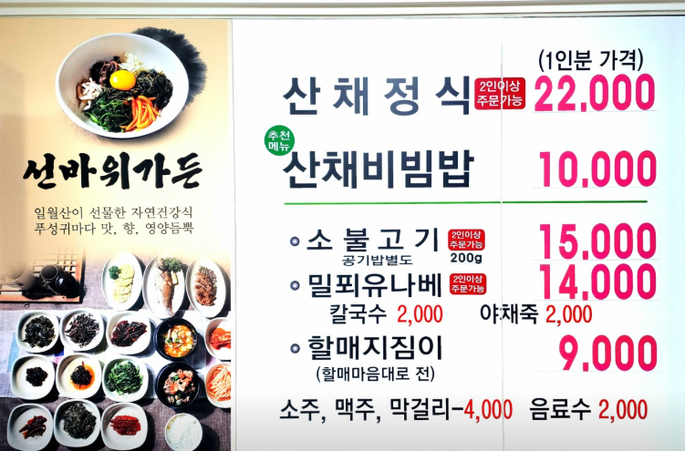 - 산채정식: 다양한 산나물 반찬과 함께 제공되는 정식 메뉴로, 자연의 맛을 가득 담았습니다.