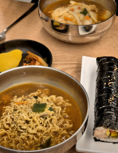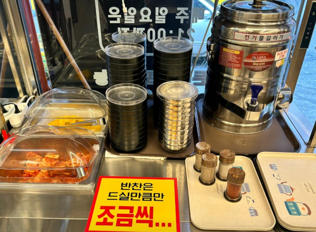 가게 내부는 깔끔하고 청결하게 유지되어 있어 편안한 식사 환경을 제공합니다. 4인용 테이블뿐만 아니라 2인용 테이블도 마련되어 있어 혼밥을 즐기는 손님들도 부담 없이 방문할 수 있습니다. 셀프 코너에는 단무지와 김치가 준비되어 있어 취향에 맞게 곁들여 먹을 수 있습니다.