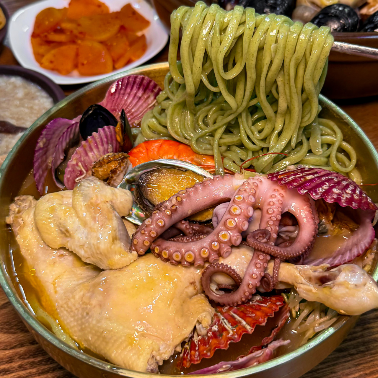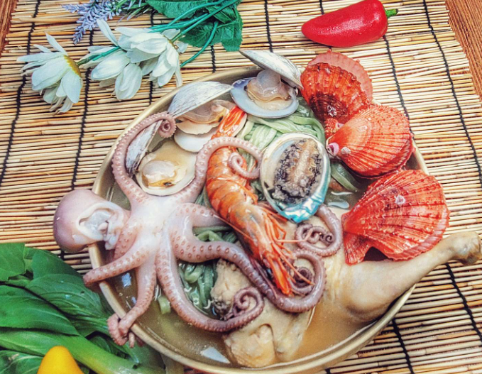- 울산맛집 대왕암돌미역닭국수에서는 상황버섯과 약선한약재16가지를 우린 육수에 가리비,조개,낙지,새우,전복이,게를 넣어 약간의 칼칼한 매운맛이 더해있는 해신탕입니다. 해신탕 드시고 칼국수 드시고 들깨 죽까지 코스로 서비스 해드립니다