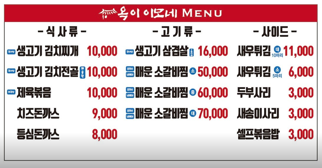| 매운 소갈비찜 (소) | 50,000원 (소) 60,000원 (중) 70,000 (대) |