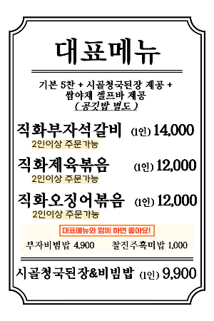 - 직화오징어볶음: 탱글탱글한 원양산 오징어를 특제 양념과 직화 불맛으로 조리한 인기 메뉴입니다.
